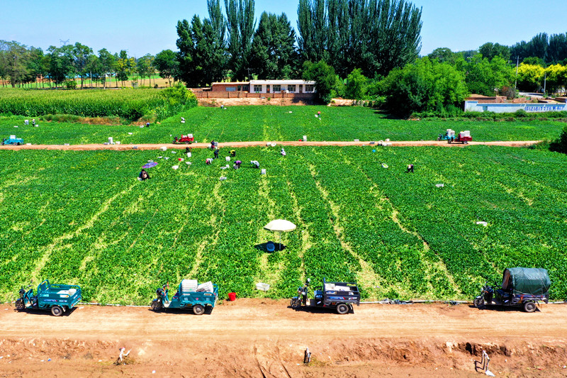 7月29日,贺兰县金贵镇红星村蔬菜种植基地,采摘工人在采收,田间道路上运输车辆就绪。新鲜菜心及时装车外运,畅销粤港澳大湾区市场。“宁夏菜心”是国家农产品地理标志产品,贺兰县作为“宁夏菜心”的主产区,年产量达16.7万吨。该县从传统农业县向高端蔬菜供应基地转型,全县冷凉蔬菜总产值超21亿元,基本形成“四季不断档、常年有鲜菜”的供应格局。记者 王鼎 白茹 摄