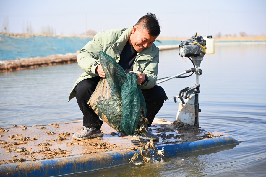 3月9日,贺兰县“水上春耕”正式启幕。1000公斤从安徽空运来的中华绒螯蟹蟹苗抵达常信乡丁义村宁夏顺盈农牧大闸蟹养殖基地,经过消毒浸泡,被投放池塘。这是当地今春首批入池蟹苗。近年来,贺兰县依托黄河水资源大力发展生态渔业,推广“早熟母蟹”模式,以优质种苗、科学养殖、畅通产销打造“塞上湖蟹”特色品牌,以特色水产养殖助力乡村产业振兴。今年,该县计划河蟹养殖面积1.8万亩,预计产量突破1100吨、产值达1.65亿元。宁夏日报报业集团全媒体记者 王若英 见习记者 杨恺 李萌 摄