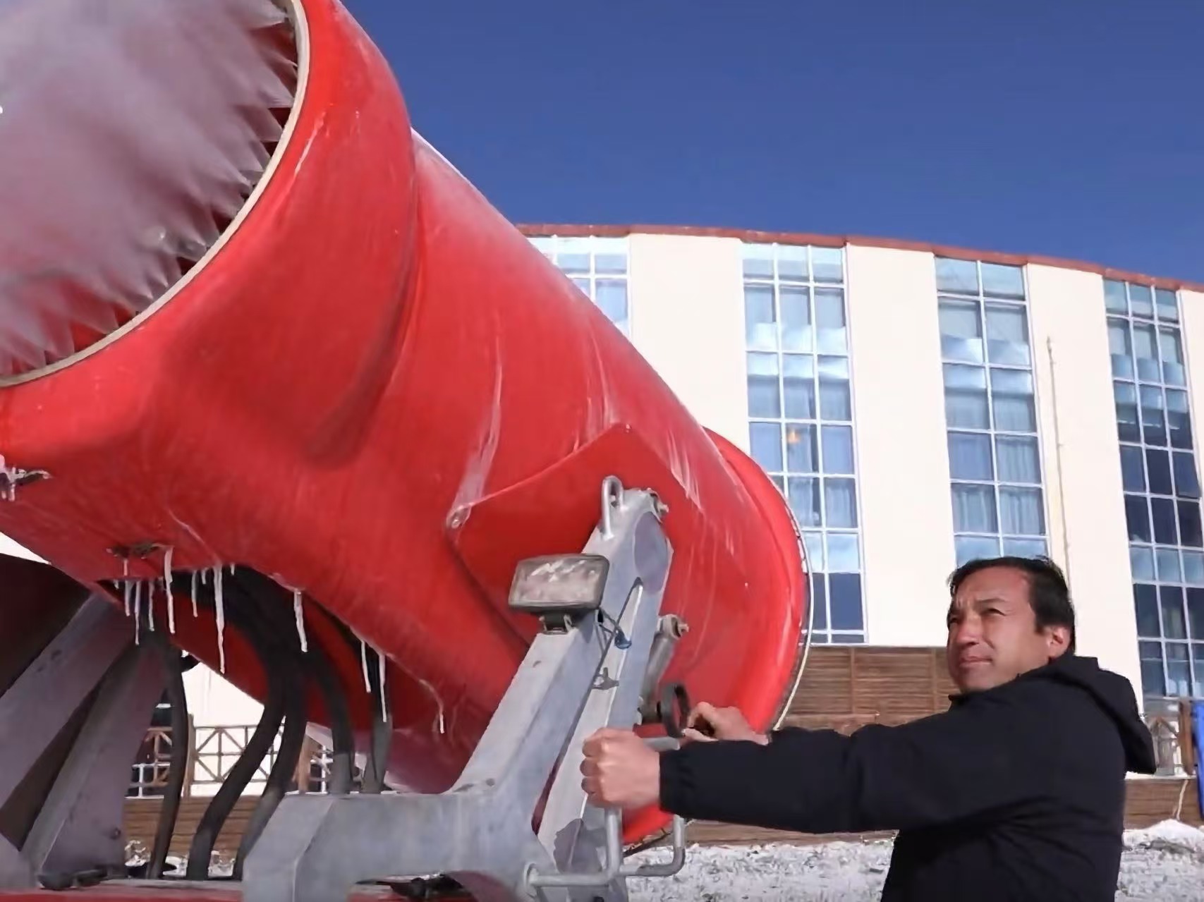 11月25日,当地最低气温降至-12℃,达到了理想的造雪条件,宁夏雅豪国际滑雪场(一期)工作人员操作造雪机实施造雪作业,同时对雪具进行维护和整理,确保设施完好。