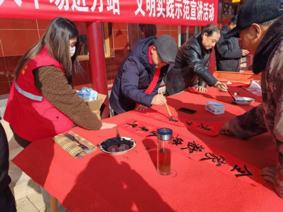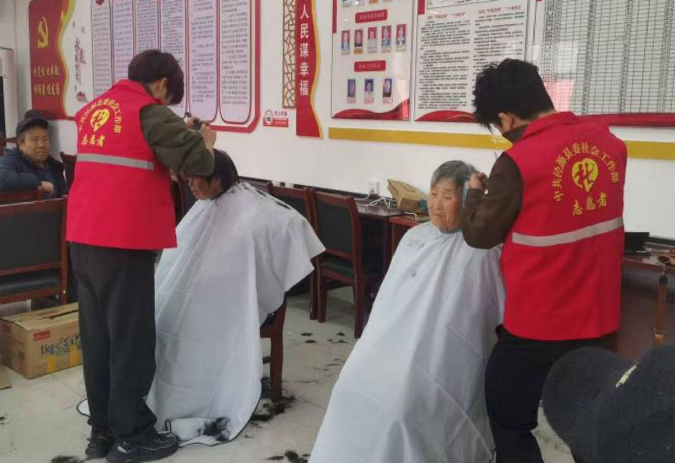 医疗服务专区内,医护志愿者为70余名群众提供血压、血糖检测及慢性病用药指导,建立健康档案30余份,同时组建上门义诊团队,为15户行动不便的独居老人提供康复理疗服务。文联书法家现场挥毫,书写“孝善传家”“移风易俗”主题春联130余副并免费赠予村民。志愿者还为10户家庭拍摄全家福,定格幸福瞬间。简易理发台前,志愿者为20余名独居老人、留守儿童免费剪发,传递细腻关怀。
