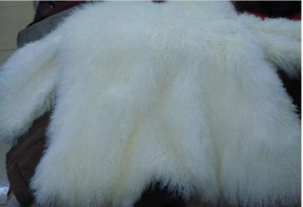 4、产品产后处理: 二毛皮的处理:先将刚宰的二毛皮剥成活板,再晾成干板。然后,板向地,毛朝上,人站在毛板中间使劲拉向四周。冬天,有一天一夜就可以起板了,起板后搭到绳子上晾干。凉板时,冬天可以板向外,舂、夏、秋三季需将皮板放在阴凉处,不可以暴晒。之后,将皮板上的死肉、脂肪等铲干净,就可以下缸“熟”皮了。“熟”是为了将生板变成熟板,使二毛皮变得柔软、少异味。熟皮的用料,以米石为主,硝、盐为辅,七八成石,二三成硝或盐,用料要适当。 二毛皮出缸后,晾干,在进行扣、铲,扣铲时既要做好配皮的选择。冬皮为优等皮,春皮次之,夏皮又次之。 在制作的过程中,先将熟好的二毛皮晾干洗净后,取其四浅窠皮(羊腹部与四肢接合部)、四肢、颈部下脚料,轻微沾湿(用口或用喷壶),毛向里钉在木板上,另一面在沾水,用劲拉长拉宽,边拉边钉小钉。之后,放在日光下晒干,取下小钉刷干净,现用皂荚水洗出花弯,用木板压一压,就可以裁剪了。裁好样子后,现用“大针子”(每针之间的距离较大,也较随意)串联起来,然后精工细缝,一件二毛皮货就算完成了。 [1]