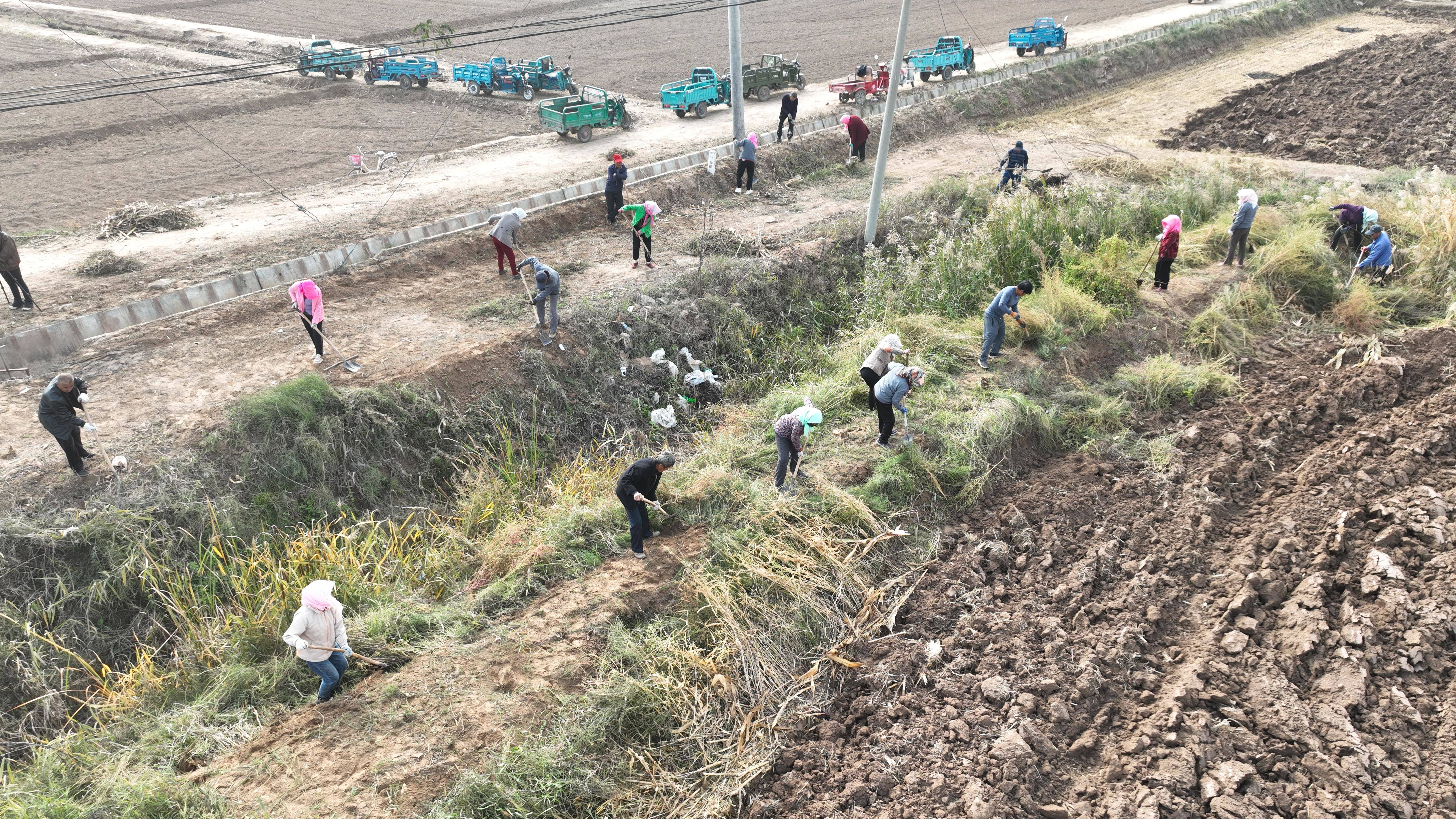 10月8日,在青铜峡市叶盛镇丰登沟和黄家沟,村民们正在挥锹平整土地、清理林带及沟渠枯枝杂草、为树木涂红刷白,大家干劲十足。