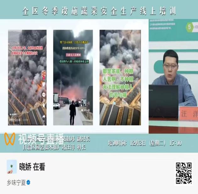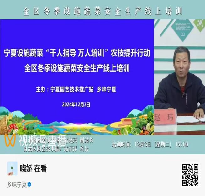 按照全国农技中心设施蔬菜“千人指导 万人培训”农技提升行动任务要求,落实好防灾减灾关键技术,加强冬季设施蔬菜安全生产,抓牢“菜篮子”稳产保供,12月3日,自治区园艺技术推广站通过“乡味宁夏”微信视频号,组织开展“全区冬季设施蔬菜安全生产线上培训”。各市、县(区)农技中心技术干部,设施蔬菜生产企业、合作社负责人及农户639人参加培训,在线点赞7759人(次)。
