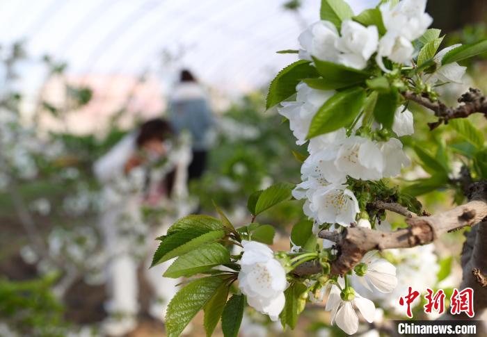 2月26日,宁夏银川市金凤区良田镇的温室大棚内樱桃花竞相盛开,市民漫步其中感受着春天的气息。中新社记者 于晶 摄