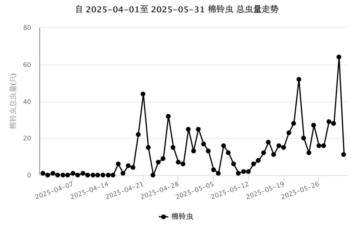 图1 4月1日—5月31日全区32台测报灯棉铃虫诱蛾情况