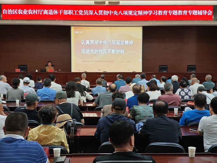 7月29日,自治区农业农村厅组织召开厅系统离退休干部专题辅导会,进一步深入学习贯彻中央八项规定精神。厅机关离退休干部各党支部党员、厅属各事业单位离退休干部职工党员、自治区农学会党支部党员及相关负责离退休干部工作人员共计96人参加学习。