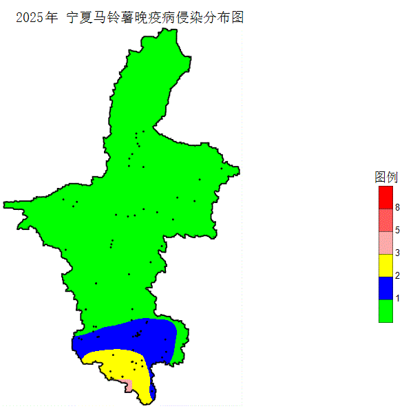 据宁夏气候中心预测,7~8月气温比常年同期偏高,其中中北部平均气温偏高1.0-1.5℃,南部山区偏高0.5-1.0℃;各地降水量比常年同期偏多10%-20%。降水偏多有利于马铃薯晚疫病、早疫病等病害的发生发展。