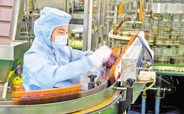 位于灵武市的华信达健康科技有限公司无菌灌装车间,工人灯检瓶装枸杞原浆。