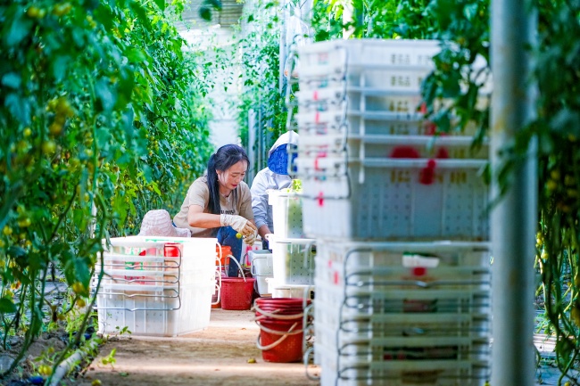 近日,银川市兴庆区掌政镇五渡桥村育苗中心大棚内,工人对小番茄进行分拣。成熟的小番茄除供应本地商超外,还通过冷链物流发往北京、上海等市场。该番茄种植基地逐步成为吸纳就业、促进增收的“强磁场”。记者 李宏亮 摄