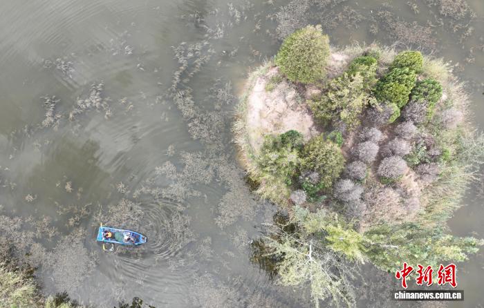 图为工作人员正在捕捞螃蟹。(无人机照片)中新社记者 于晶 摄