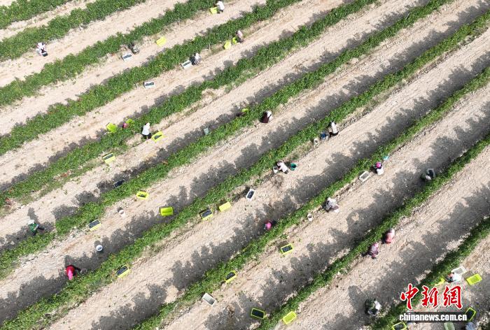 10月7日,宁夏银川,工作人员在贺兰山东麓一酿酒葡萄种植基采收葡萄。(无人机照片)中新社记者 于晶 摄