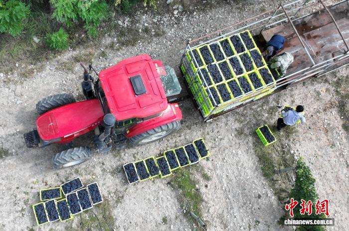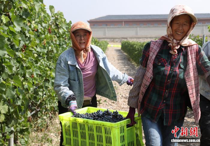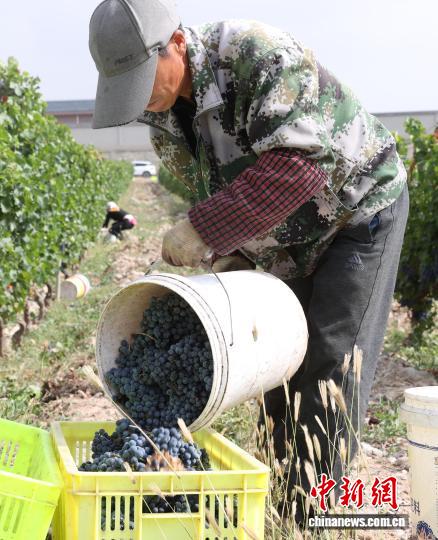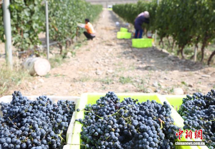10月7日,宁夏银川,工作人员在贺兰山东麓一酿酒葡萄种植基采收葡萄。中新社记者 于晶 摄