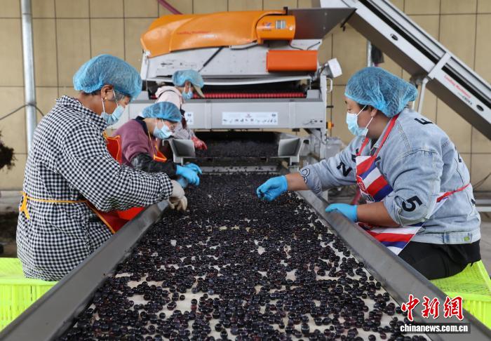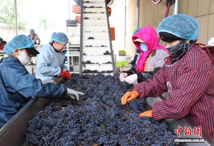 10月7日,宁夏银川,工作人员在贺兰山东麓一酿酒葡萄生产线上分拣葡萄。中新社记者 于晶 摄