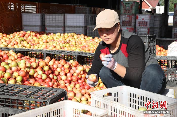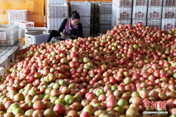 10月7日,工作人员在宁夏银川金凤区良田镇和顺新村果蔬仓储分拣中心将西红柿分拣装箱。中新社记者 于晶 摄