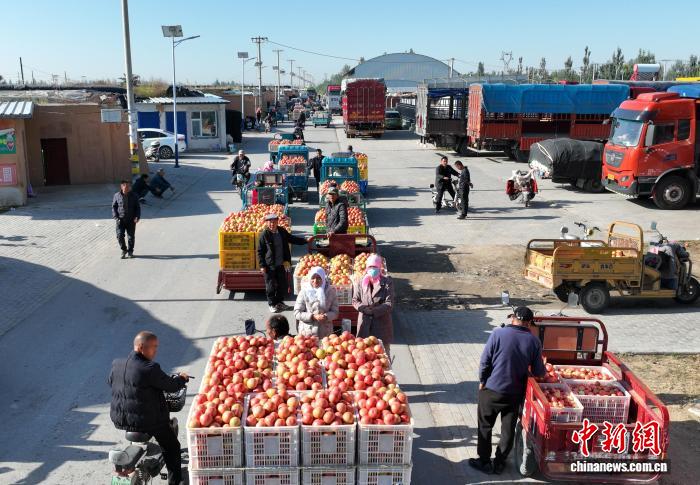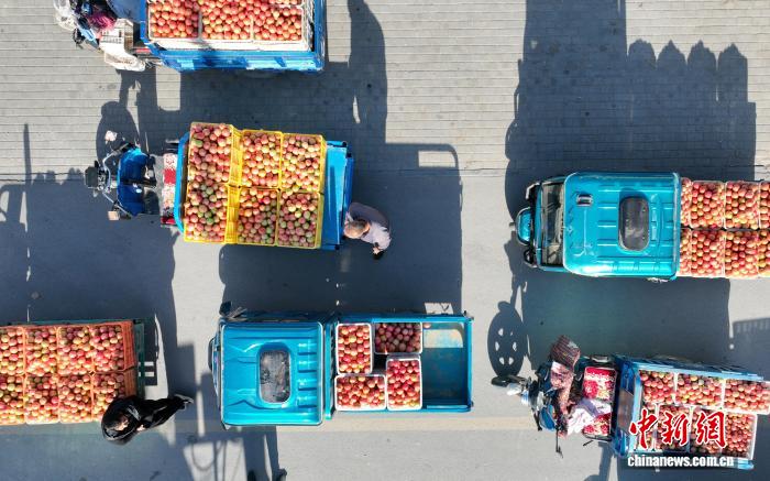 10月7日,菜农将采摘好的西红柿送往宁夏银川市金凤区良田镇和顺新村果蔬仓储分拣中心。(无人机照片)中新社记者 于晶 摄