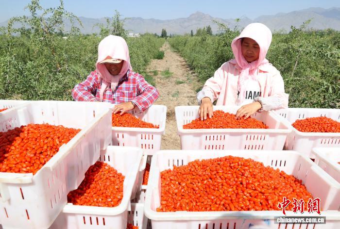 资料图为农户在宁夏一处枸杞种植基地分拣刚刚采摘的枸杞鲜果。 中新网记者 于晶 摄