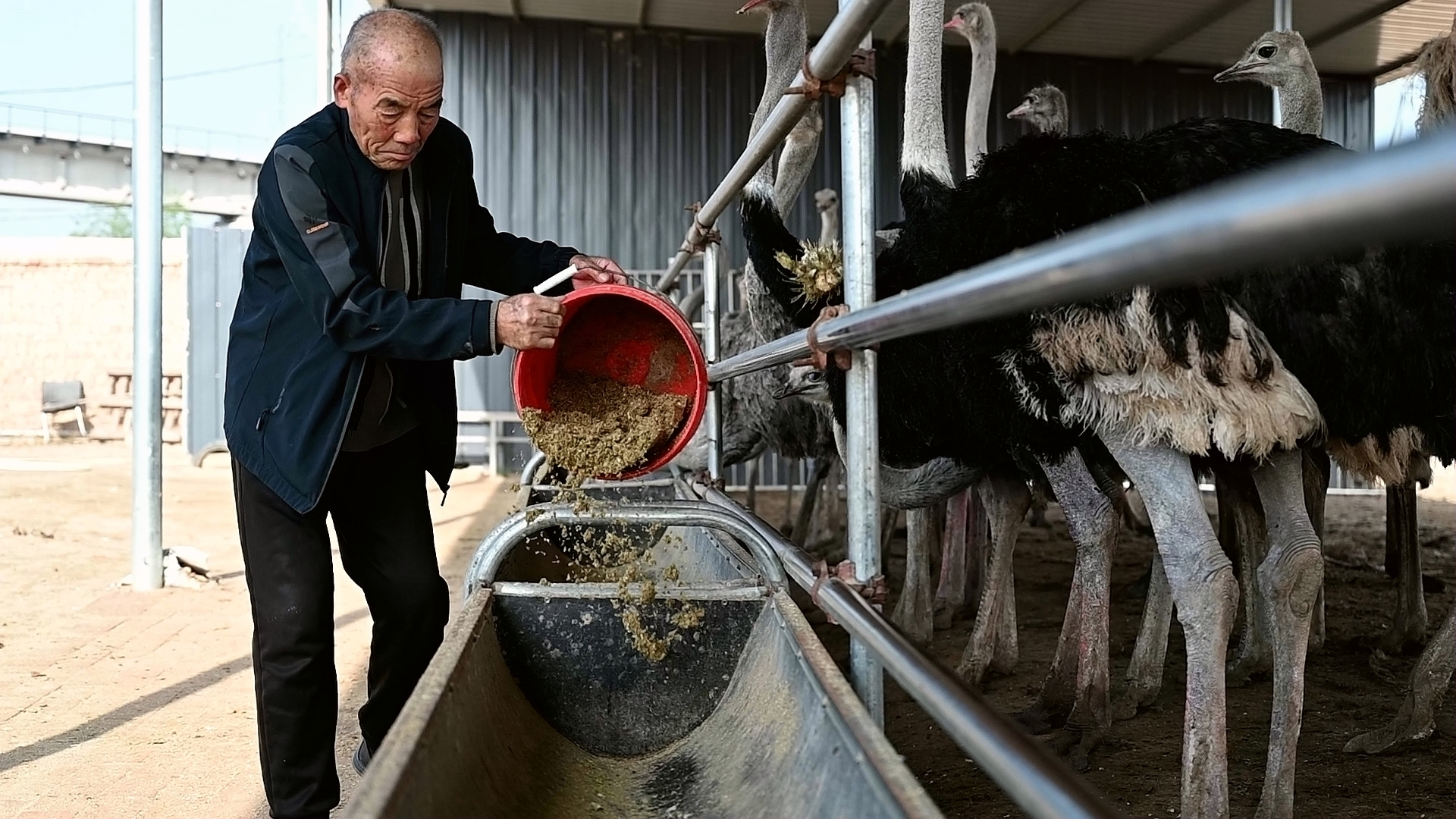 10月17日,记者在良田镇兴源村富兴源鸵鸟养殖示范基地看到,占地10亩的养殖场整洁有序,养殖人员马福义正推着饲料车投喂,成群健硕的鸵鸟围拢进食,昔日的闲置土地正转化为村集体经济新增长点。