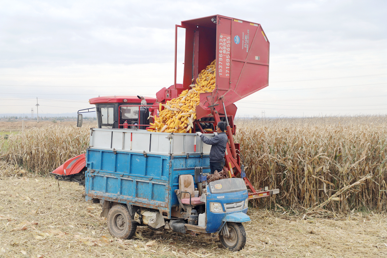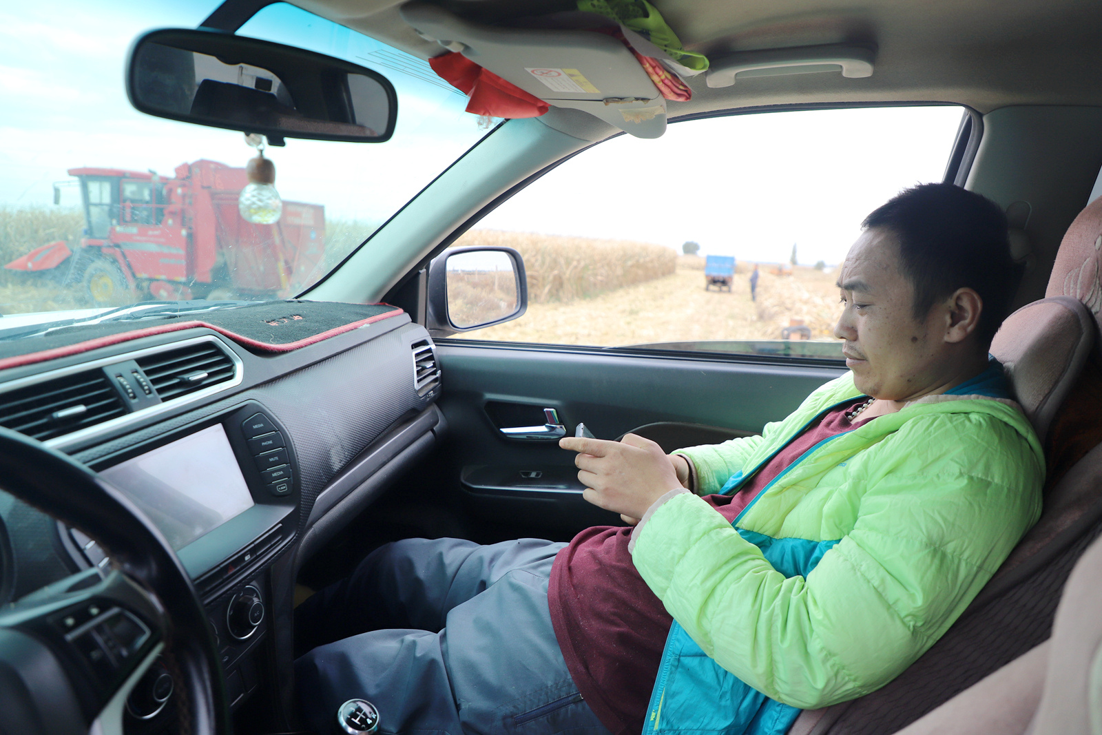 中航路边,农机手驾驶大型收割机驶入玉米地里,开始忙碌。一边,与高位截瘫抗争了7年的中圈塘村村民蔡帅在车里联系着业务。今年32岁的他本是一名装载机司机,事故发生后,装载机被闲置在家中,家人和孩子需要照顾,日子过得非常艰难。但他并没有气馁,而是凭借之前积攒的人脉,雇佣了司机,把自己的装载事业又发展了起来。2022年,他贷款买了一辆皮卡车,雇佣司机拉着他跑业务。接不到活的时候,他就在家分拣枸杞,琢磨着在线上销售自家农产品。功夫不负有心人,他的生意越做越顺,2024年又买了一辆收割机。如今,蔡帅不光还清了贷款,每年还能收入20万元。