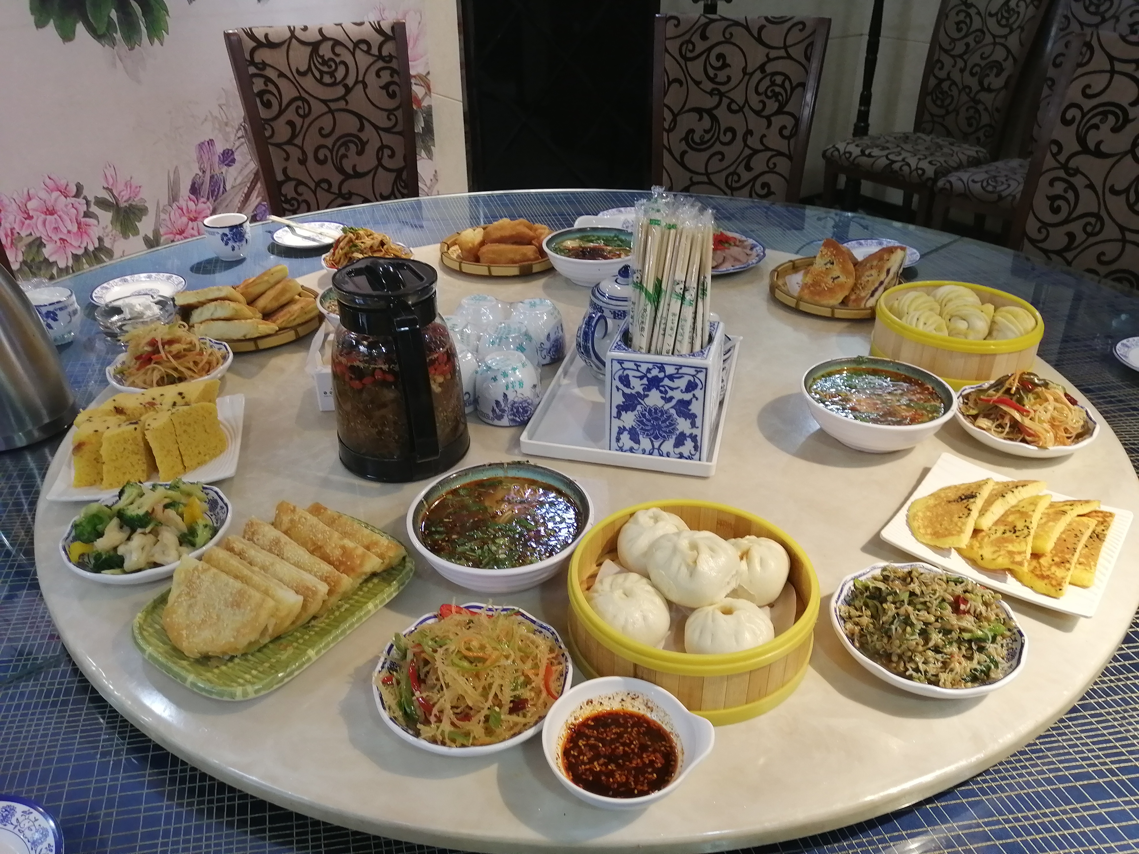 清晨七点,吴忠市的早茶店便座无虚席,每张桌子上都摆着一壶热气腾腾的八宝茶,还有手抓羊肉、牛肉饼、粉汤饺子、油香、馓子等食品,让人眼花缭乱。游客围坐桌前,边喝茶边品尝美食,感受“慢下来”的宁夏生活。
