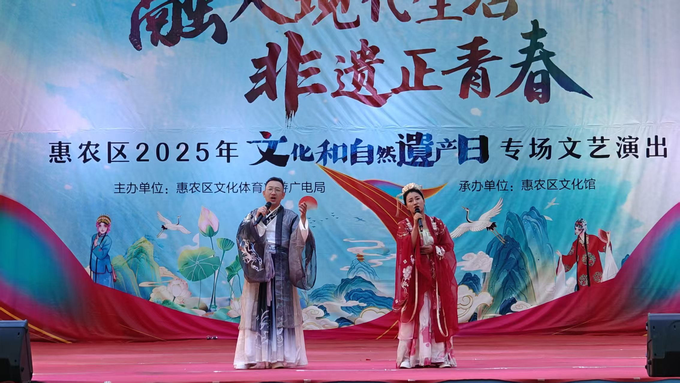 宁夏花儿是流传在宁夏地区的一种民歌,被誉为“中国西北之魂”。它的旋律高亢悠扬,歌词生动形象,大多以爱情、生活、劳动为主题。在“宁艺好戏”的巡演中,宁夏花儿的演唱形式多样,既有单人演唱,也有男女对唱、合唱。歌手们穿着鲜艳的服饰,手持话筒,用洪亮的嗓音演唱着《雪白的鸽子》《漫花儿》《大眼睛》等经典曲目。除了传统的花儿曲目,歌手们还会演唱一些改编的花儿歌曲,将现代元素融入其中,让宁夏花儿更具时代感,吸引了许多年轻观众。