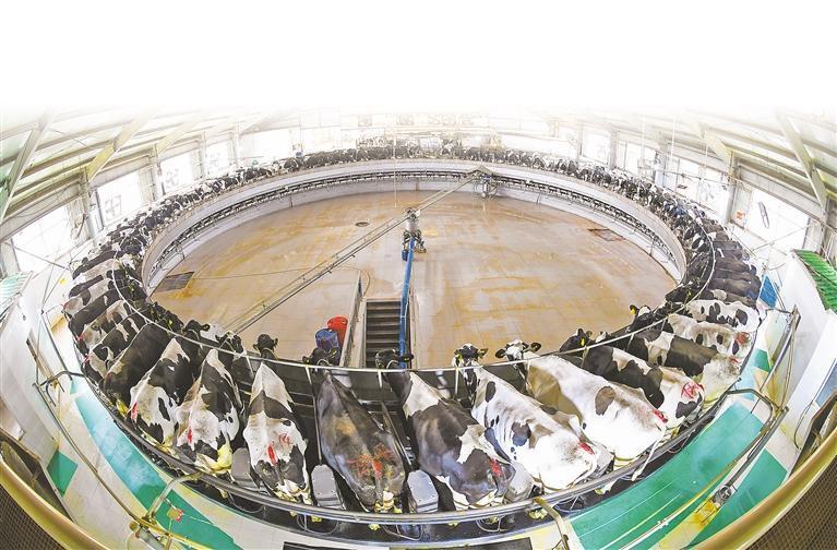 清晨,阳光洒向宁夏农垦乳业平吉堡第六奶牛场。奶牛在现代化挤奶转盘上有序排列,享受着科技带来的高效服务。工人熟练操作智能系统,每一个动作都精准且流畅。