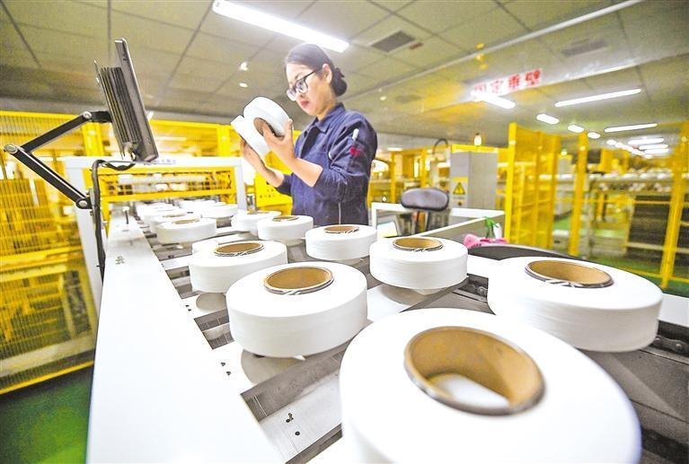 在泰和新材宁东产业园内,工人在检查刚下线的氨纶丝。