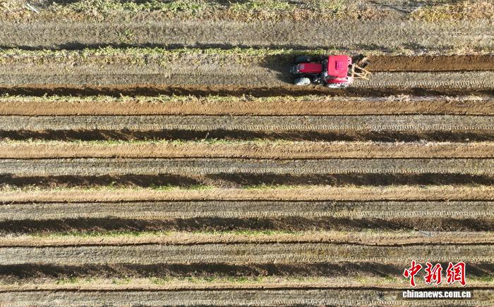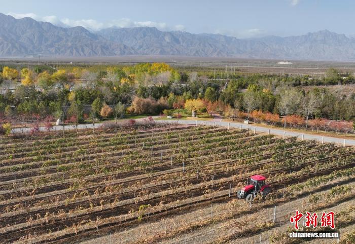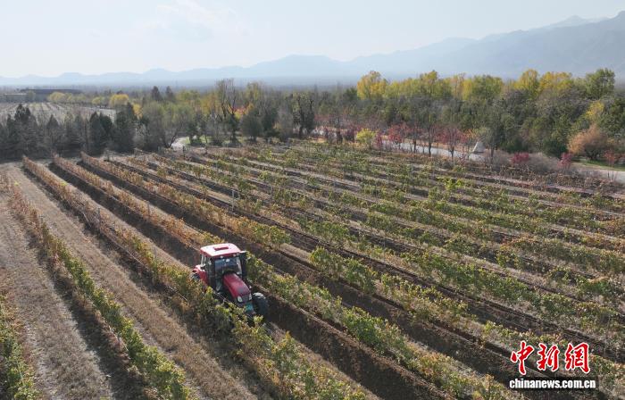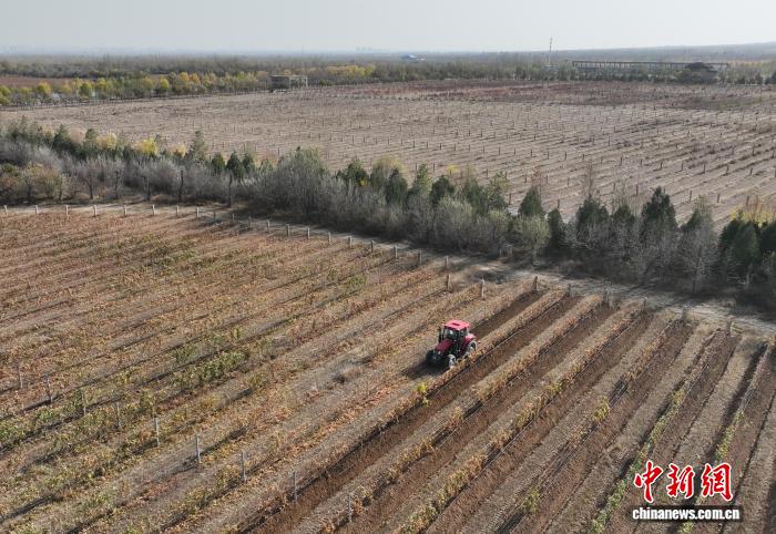 11月8日,在位于宁夏银川市贺兰山东麓的志辉源石酒庄,工作人员进行埋藤作业。(无人机照片)中新社记者 于晶 摄