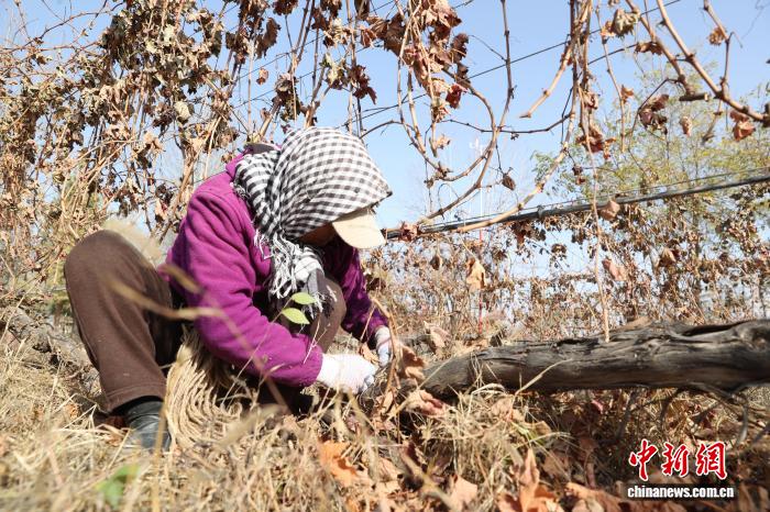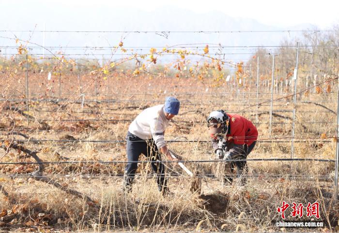 11月8日,在位于宁夏银川市贺兰山东麓的志辉源石酒庄,工作人员进行埋藤作业。近日,随着气温降低,宁夏贺兰山东麓优质酿酒葡萄产区数十万亩酿酒葡萄迎来“冬眠季”。工作人员在田间地头下架、绑藤、埋藤,帮助葡萄藤进入“冬眠”状态。冬藏埋土、春季展藤,以避免低温冻伤葡萄藤。宁夏贺兰山东麓是业界公认的最适宜种植优质酿酒葡萄和酿造高端葡萄酒的“黄金地带”之一。中新社记者 于晶 摄