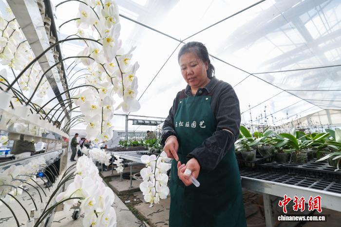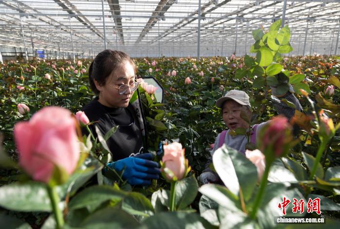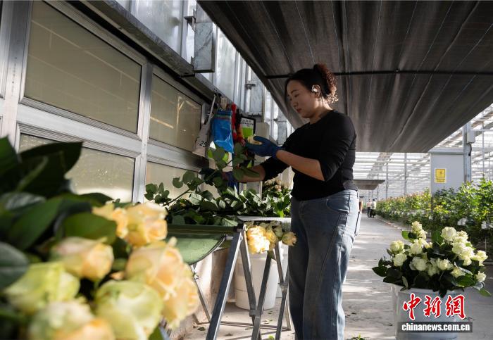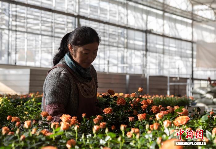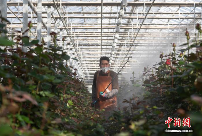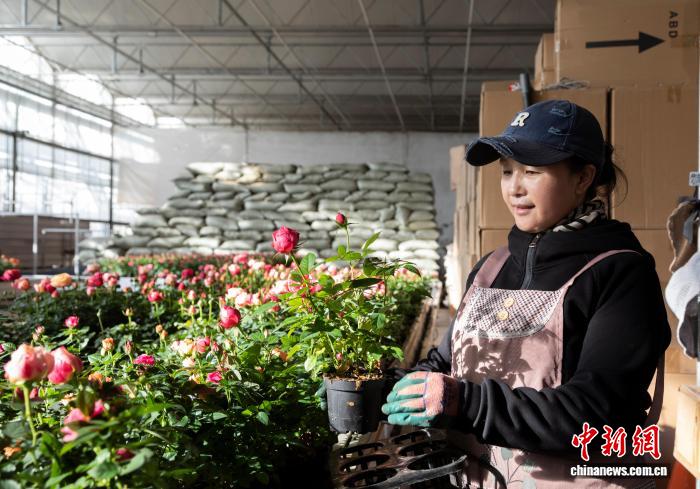 11月25日,银川市兴庆区农业高科技智慧示范园内,工人正在进行花苗养护、采摘和包装,以供应市场。近年来,宁夏银川市兴庆区建成农业高科技智慧示范园,目前花卉种植面积7000余亩,带动4000余名农户就业,花卉产业年产值稳定在1.6亿元人民币。中新社记者 杨迪 摄
