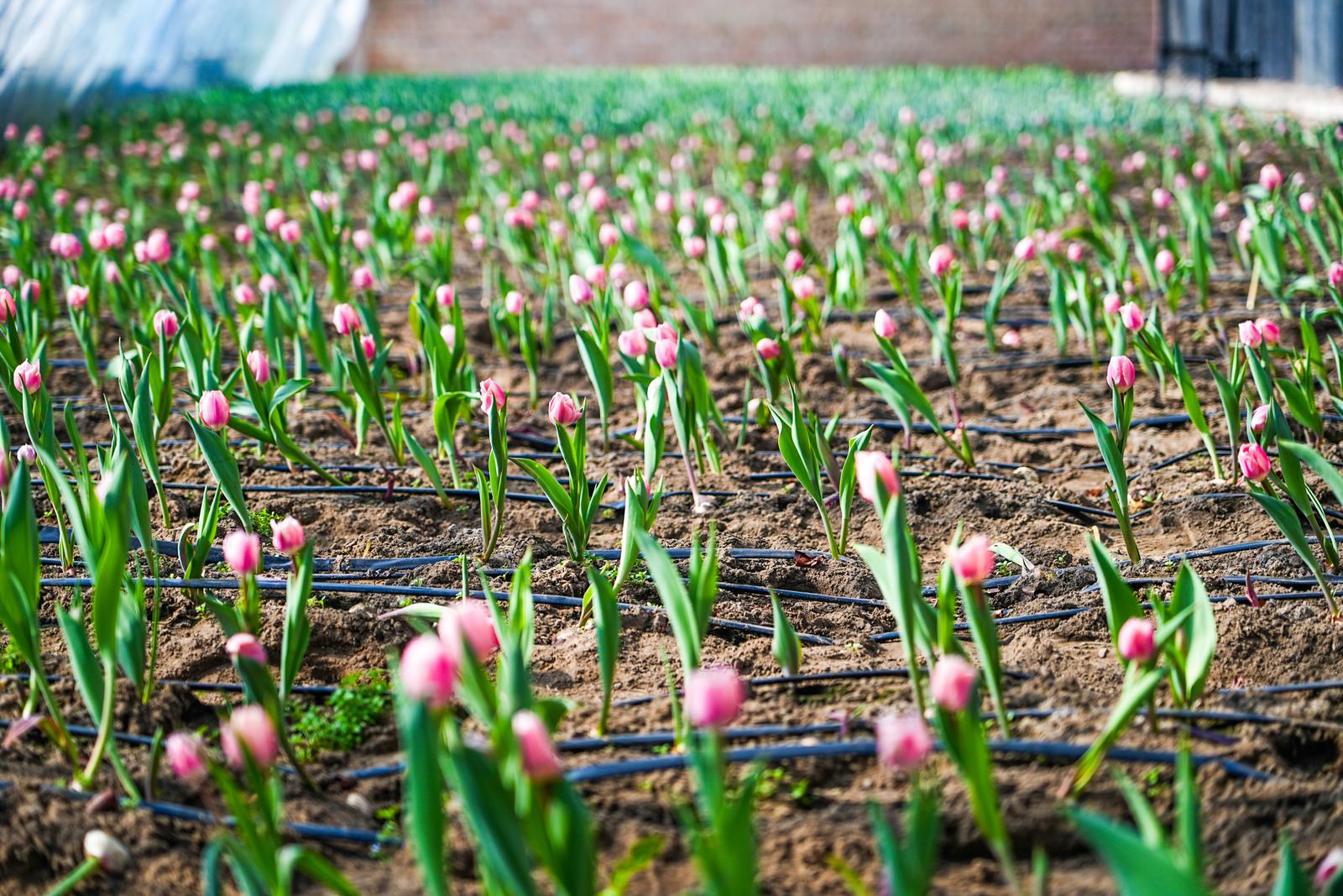 大棚内郁金香正在悄然生长,等待绽放。