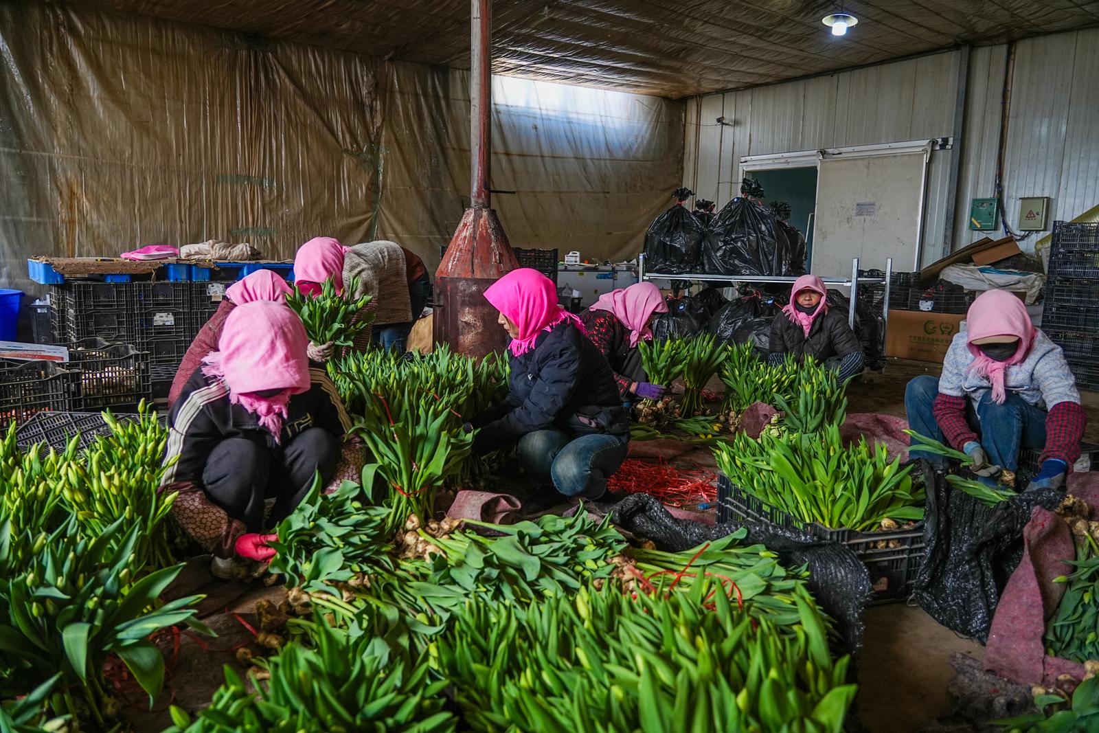 工作人员打包整理本地市场销售的郁金香。