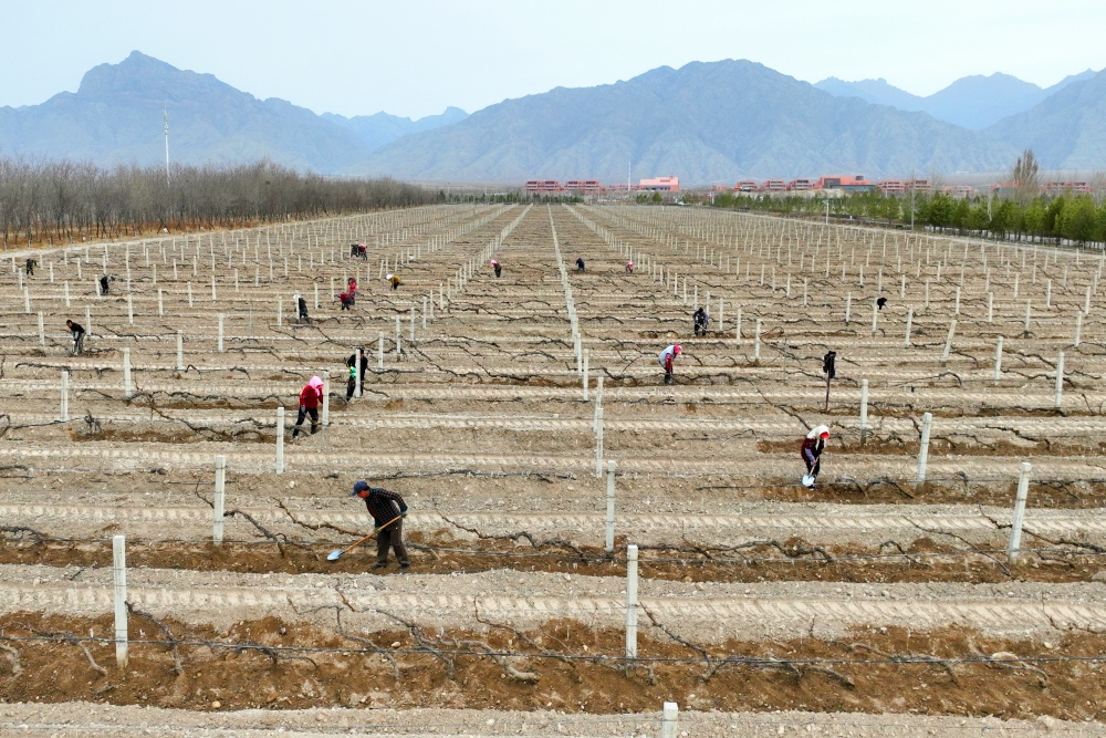 3月25日,位于宁夏贺兰山东麓葡萄酒产区的沃尔丰酒庄种植基地,工人进行展藤作业。目前,贺兰山东麓葡萄酒产区已全面进入展藤作业高峰期。记者 王鼎 马赛尔 摄