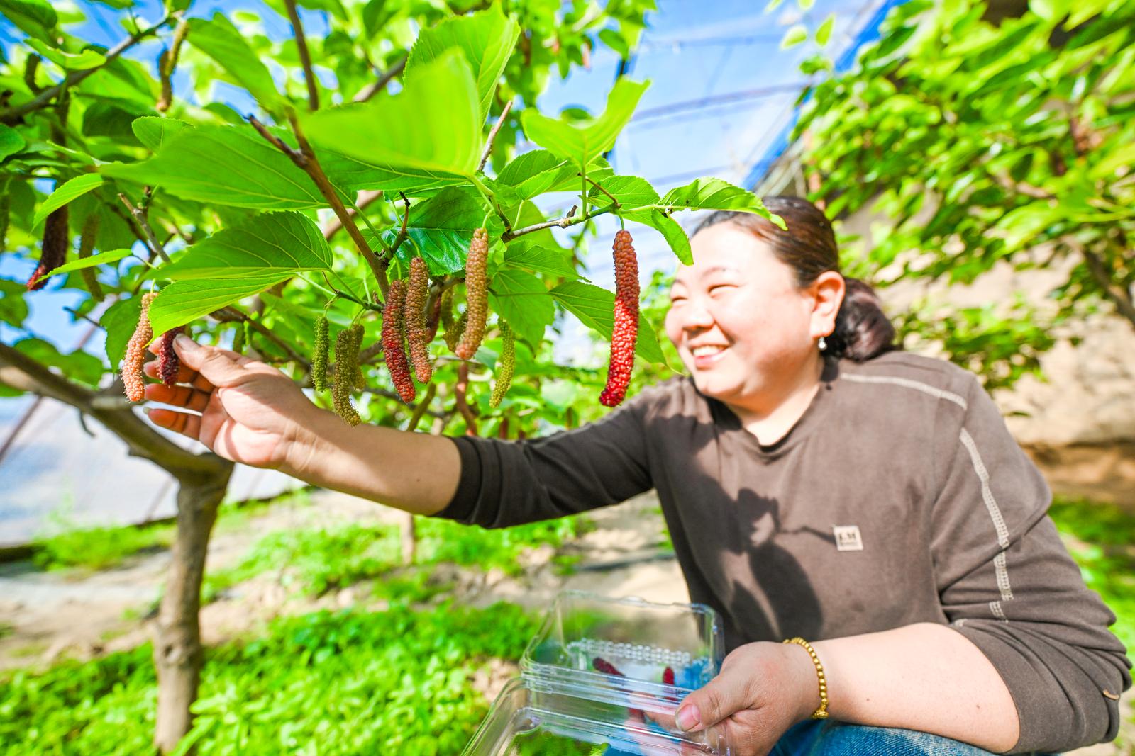 3月31日,农户陆艳荣在采摘长果桑。当日,贺兰县金贵镇雄英村露禾果蔬采摘园内绿意盎然、果香满园。从台湾地区引进的“紫金蜜葚”长果桑迎来盛果期,无花果、草莓也同步进入最佳采摘时节。近年来,雄英村依托村内千余栋设施温棚资源,持续优化产业结构,引进长果桑、无花果等优质特色果品,探索推广间作套种等高效栽培新模式。每年2月起,水果番茄、樱桃、桑葚、无花果等果蔬轮番上市,形成“四季有鲜果、全年可采摘”的产业格局。既丰富了市民近郊休闲采摘体验,也让一座座温室大棚变身村民的增收棚、致富棚。 记者 马楠 王洋 摄