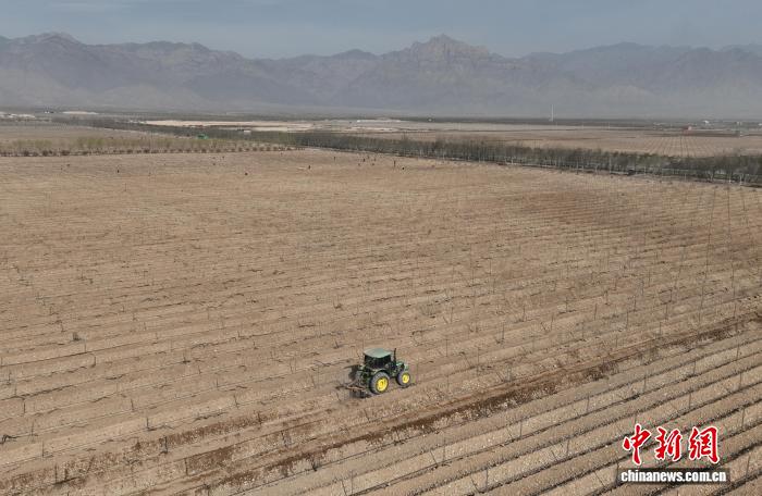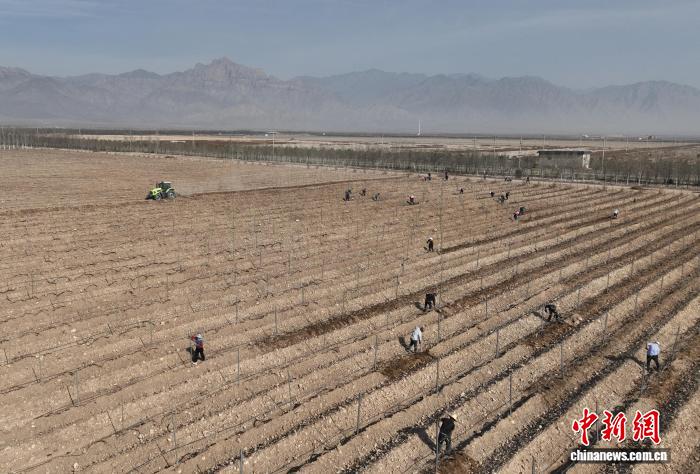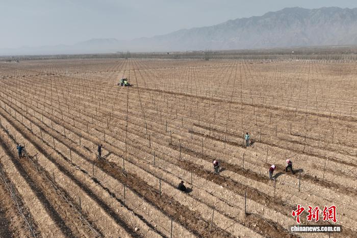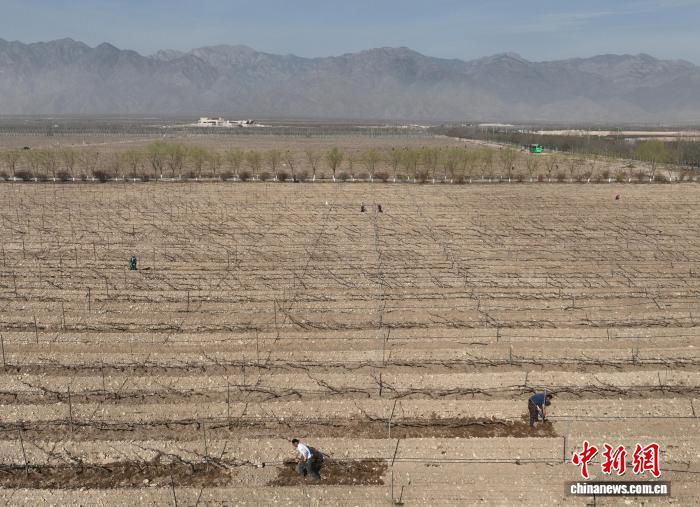 4月2日,工作人员在贺兰山东麓酿酒葡萄种植基地为葡萄展藤、培土。(无人机照片)中新社记者 于晶 摄