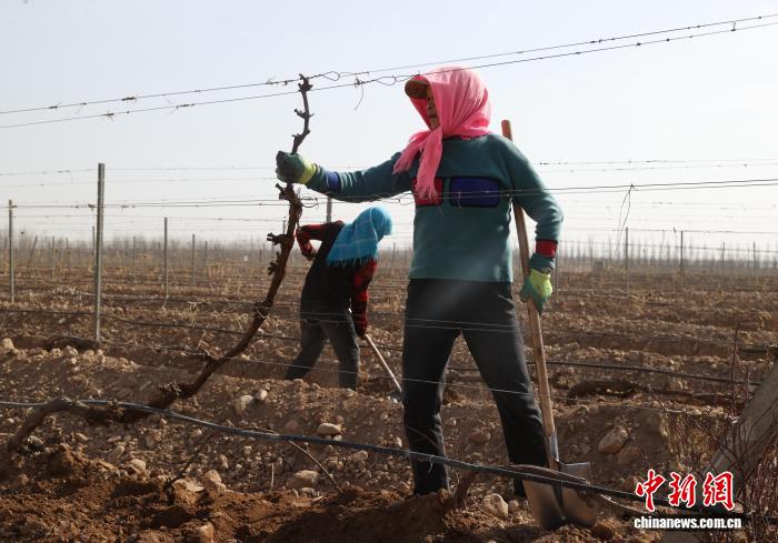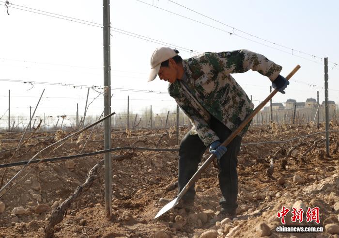 4月2日,工作人员在贺兰山东麓酿酒葡萄种植基地为葡萄展藤、培土。中新社记者 于晶 摄