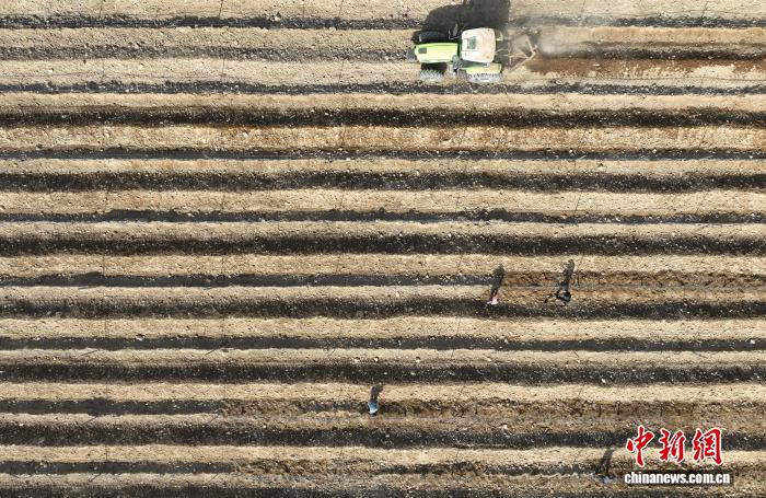 4月2日,工作人员在贺兰山东麓酿酒葡萄种植基地为葡萄展藤、培土。随着气温回暖,在宁夏贺兰山东麓的优质酿酒葡萄产区,60.7万亩酿酒葡萄结束“冬眠”,迎来春季展藤。冬藏埋土、春季展藤,是中国北方一些葡萄产区独特的农耕措施,以避免冬季低温冻伤葡萄藤。宁夏贺兰山东麓位于北纬37度至39度,是中国最大的酿酒葡萄集中连片种植区和酒庄酒产区。(无人机照片)中新社记者 于晶 摄