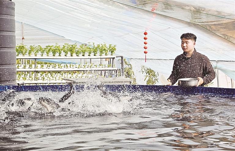 3月30日,位于永宁县闽宁镇原隆村的宁夏鲜沃农业开发有限公司“鱼菜共生”养殖基地,鲈鱼在水中翻腾跳跃,旁边的水培芹菜、番茄长势喜人。该公司有15栋现代温室大棚,其中10栋建设了“鱼菜共生”系统,每日销售番茄2000公斤、鲈鱼100公斤,产品销往宁夏、上海、广东等地。记者 左鸣远 摄
