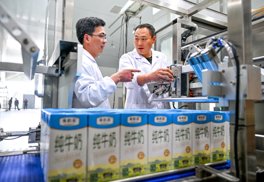 4月14日,石嘴山市大武口区昆宁森态乳业(宁夏)有限公司,工人在调试自动化包装线。该公司建设了奶粉和液态奶2座车间,一期建成后,5条智能化生产线可日产液态奶600吨,其中3条生产线专为星巴克、瑞幸等咖啡品牌定制调制乳。目前已进入试生产,预计5月初正式投产。记者 王晓龙 白茹 摄
