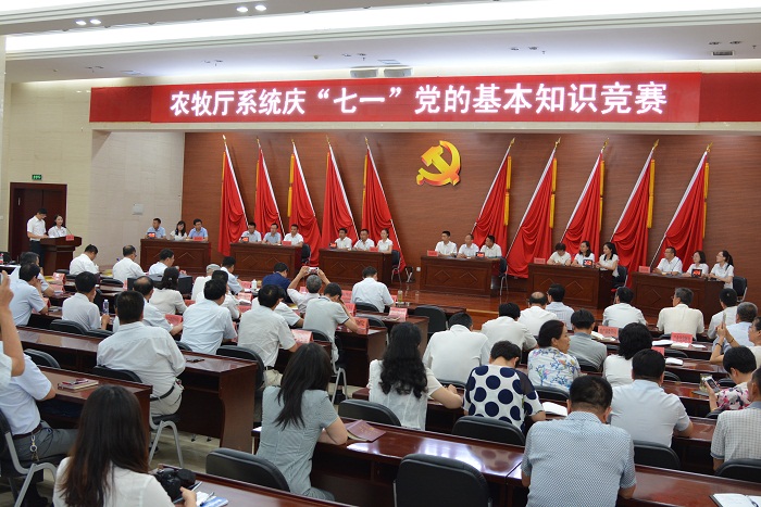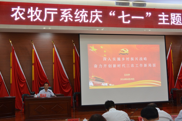 6月28日,农牧厅系统组织开展庆“七一”主题党日活动,庆祝中国共产党成立97周年,厅党组书记、厅长王文宇带领与会党员干部重温入党誓词、以《深入实施乡村振兴战略,奋力开创新时代“三农”工作新局面》为题讲授专题党课,深入学习贯彻习近平新时代中国特色社会主义思想,动员和激励全厅各级党组织和广大党员干部,振奋精神、实干兴宁,奋力开创新时代我区“三农”工作,大力实施乡村振兴战略新局面。党课后,举办了党的基本知识竞赛决赛,有6个单位分获一、二、三等奖。厅领导班子成员、机关全体党员、直属事业单位处级党员领导干部参加活动。