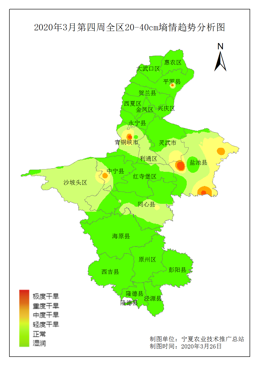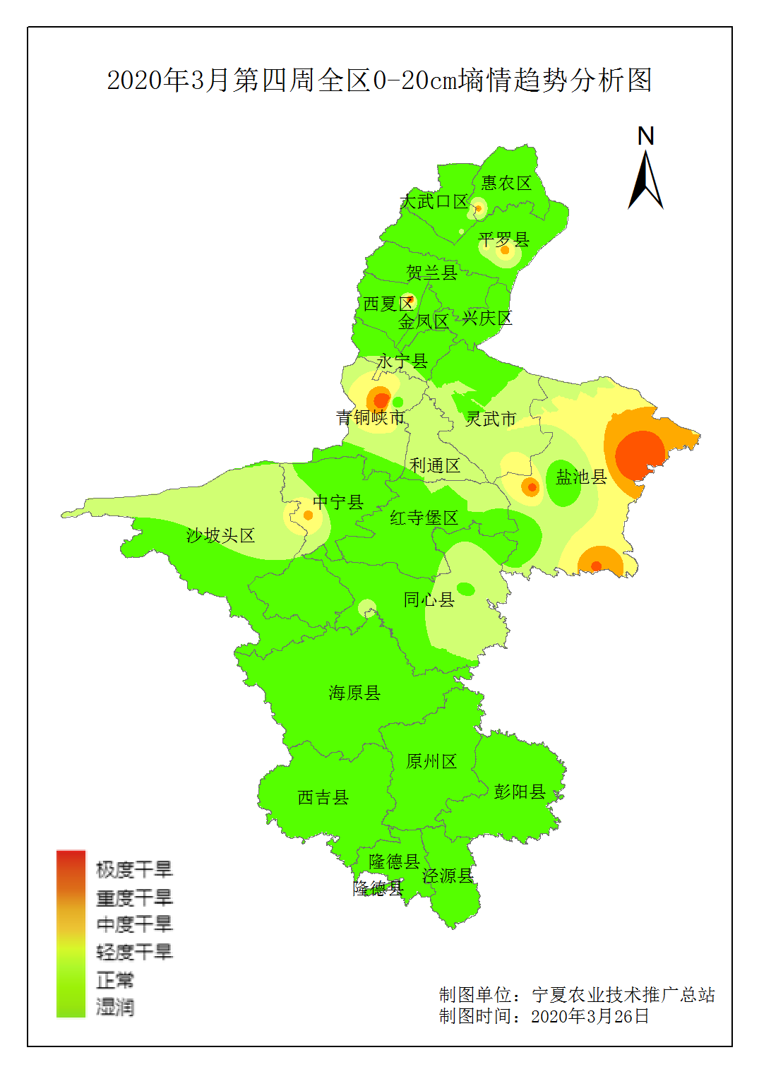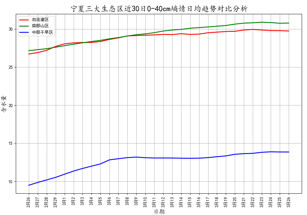 从近30日土壤墒情变化趋势图看,全区土壤墒情受降水影响持续好转。引黄灌区土壤墒情对春小麦苗期的生长有利,中部干旱带及南部山区近期墒情适宜,有利于顶凌覆膜和春播。