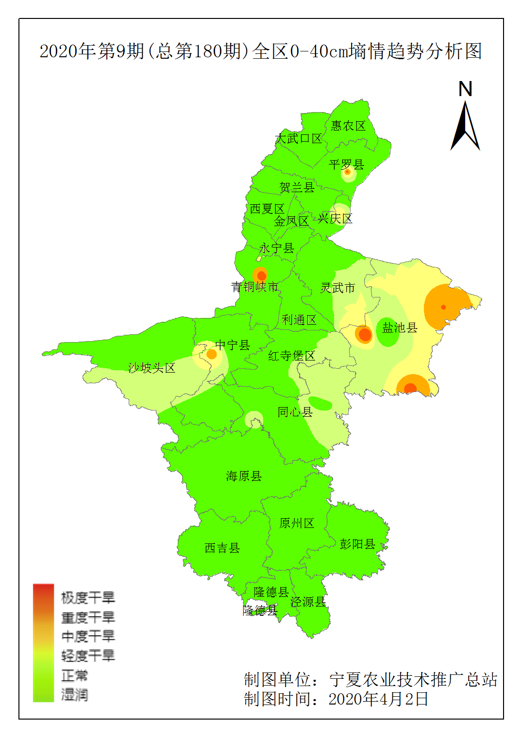 根据各县(区)4月2日自动土壤墒情监测:全区除中部干旱带部分区域墒情不足外,其余区域墒情适宜。引黄灌区墒情湿润,0~40cm土壤平均含水量为22.90%,同比增加1.30%,环比减少0.25%。中部干旱带部分及覆膜区域墒情适宜,0~40cm土壤平均含水量为15.82~17.18%,同比增加0.12~0.25%,环比增加1.02~1.15%;冬小麦及露地局部区域墒情属中度干旱,0~40cm土壤平均含水量为7.42~12.08%,同比增加0.03~1.85%,环比减少0.07~0.18%。南部山区墒情适宜,0~40cm土壤平均含水量为19.48~28.51%,同比增加2.58~4.73%,环比增加0.98~3.38%。