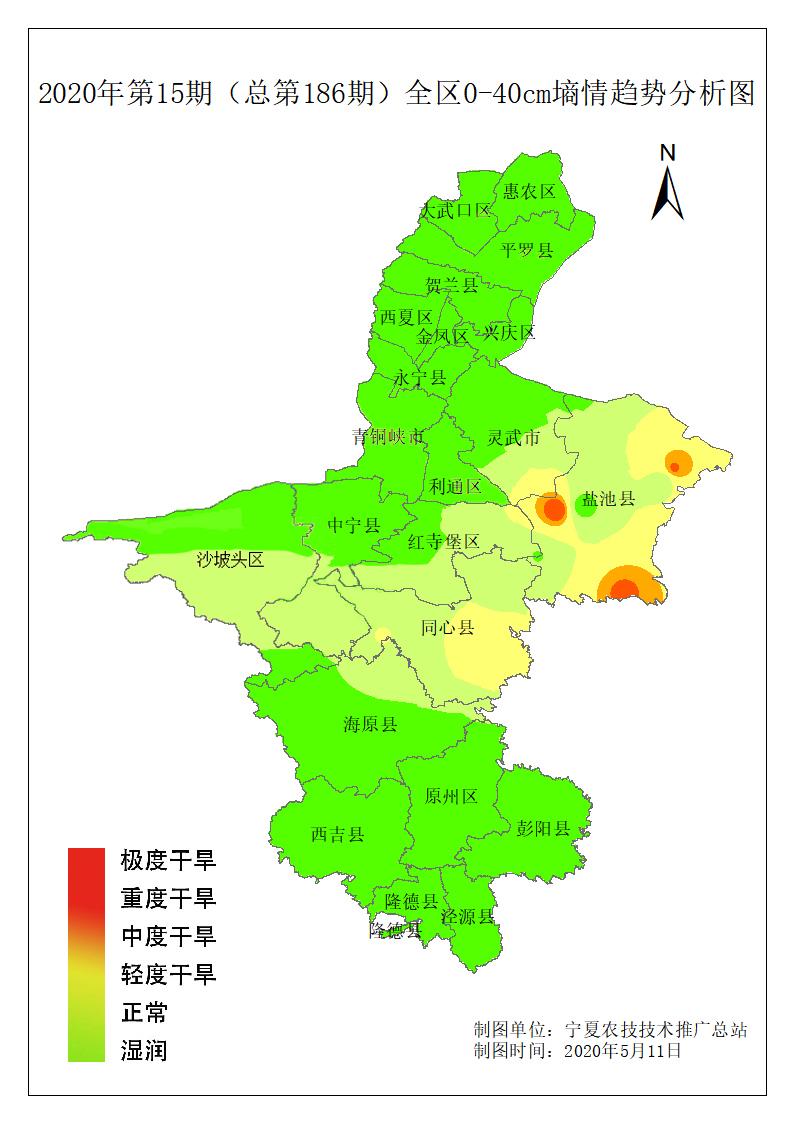 根据各县(区)5月12日自动土壤墒情监测:全区除中部干旱带部分区域墒情不足外,其余区域墒情适宜。引黄灌区墒情适宜,0~40cm土壤平均含水量为21.36%,同比减少1.65%,环比增加0.84%。中部干旱带部分及覆膜区域墒情适宜,0~40cm土壤平均含水量为15.93~18.01%,同比增加0.20~1.08%,环比增加0.91~1.68%;冬小麦及露地局部区域墒情属中度干旱,0~40cm土壤平均含水量为6.37~12.10%,同比减少2.23~2.45%,环比增加0.59~0.74%。南部山区墒情适宜,0~40cm土壤平均含水量为14.88~19.87%,同比减少3.97~5.80%,环比增加1.86~4.18%。
