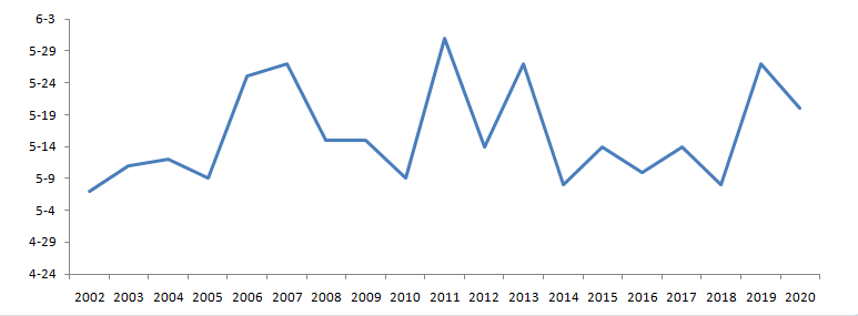 图1:2002年-2020年小麦条锈病始见期