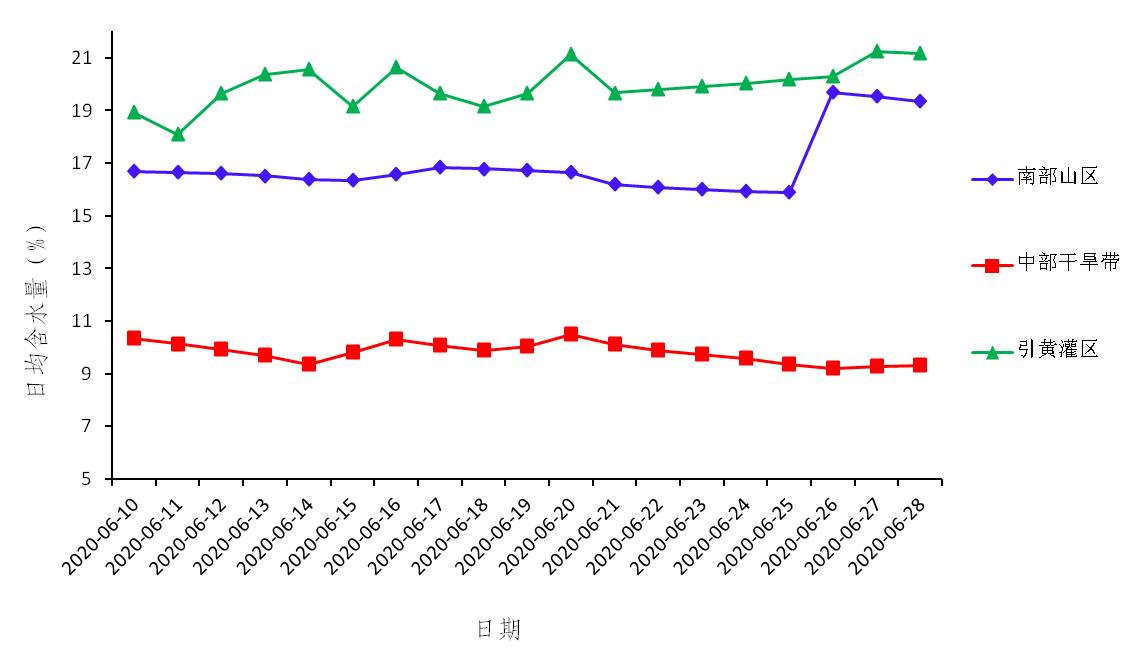 根据各县(区)6月28日自动土壤墒情监测:全区除中部干旱带大部区域墒情不足外,其余区域墒情适宜。引黄灌区墒情适宜,0~40cm土壤平均含水量为21.18%,同比减少1.06%,环比增加1.29%。中部干旱带部分及覆膜区域墒情属轻度干旱,0~40cm土壤平均含水量为13.43~16.92%,同比减少0.08~0.53%,环比增加0.09~0.30%;冬小麦及露地局部区域墒情属中度干旱,0~40cm土壤平均含水量为5.68~10.36%,同比减少0.16~0.35%,环比增加0.33~0.44%。南部山区墒情适宜,0~40cm土壤平均含水量为15.36~21.83%,同比减少0.08~1.66%,环比增加1.99~4.01%。