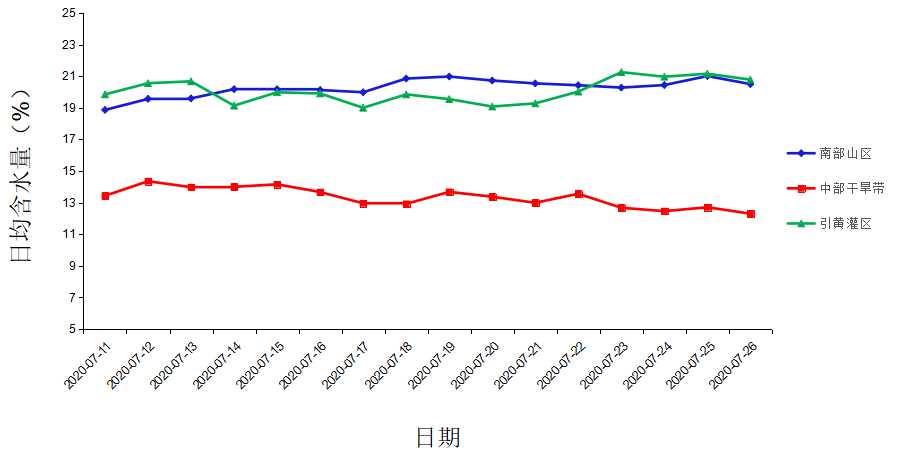 根据各生态区7月11日~7月26日墒情监测图,引黄灌区和南部山区墒情稳定向好;中部干旱带大部区域降水少,墒情不足。