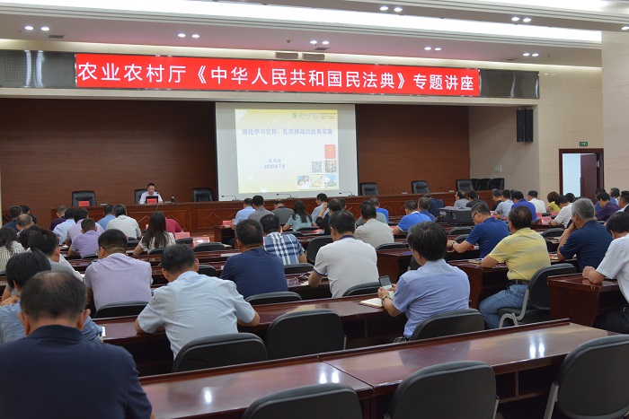 7月29日,农业农村厅举办民法典专题讲座,邀请宁夏大学法学院戴新毅教授作专题辅导,厅机关全体公务员、厅属单位副处级以上领导干部共计180余人聆听了此次专题辅导报告。报告以“强化学习宣传,扎实推动民法典实施”为主题,全面系统地阐述了我国民法典的编纂历程、民法典的重大意义和鲜明特色以及民法典视野中的农业农村工作。大家普遍认为讲座主题鲜明、内容丰富、阐述透彻,具有很强的针对性和指导性。通过专题讲座,对民法典有了较为全面的认识与理解。