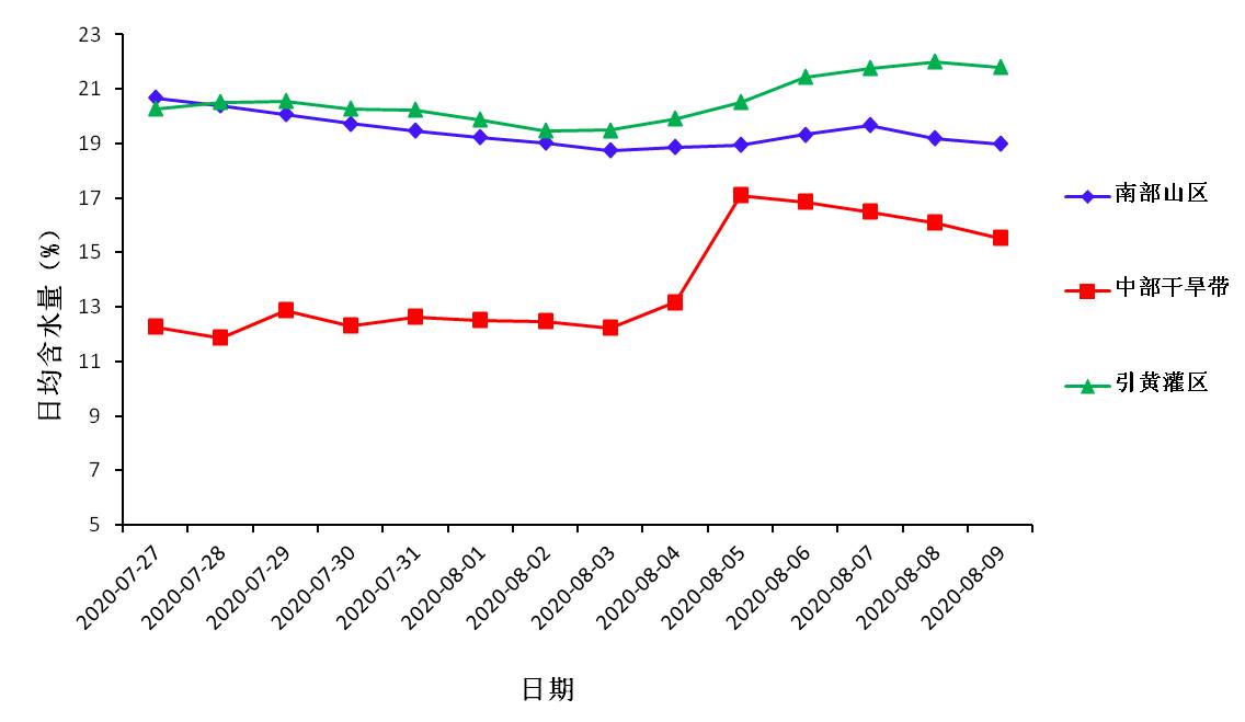 根据各生态区7月27日~8月9日墒情监测图,引黄灌区和南部山区墒情稳定向好;中部干旱带8月上旬多地出现不同程度的降雨,有效的缓解了前期的旱情。