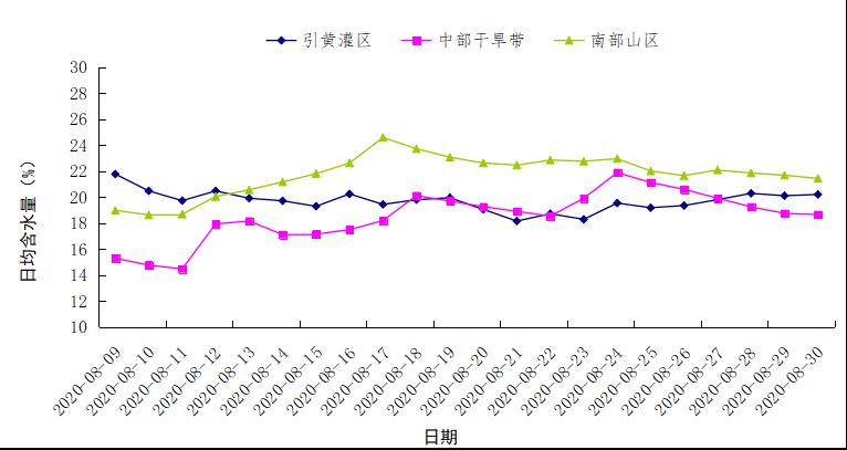 根据各生态区8月9日~8月30日墒情监测图,引黄灌区墒情稳定向好;南部山区和中部干旱带进入8月中旬多地出现不同程度的降雨,墒情持续向好。