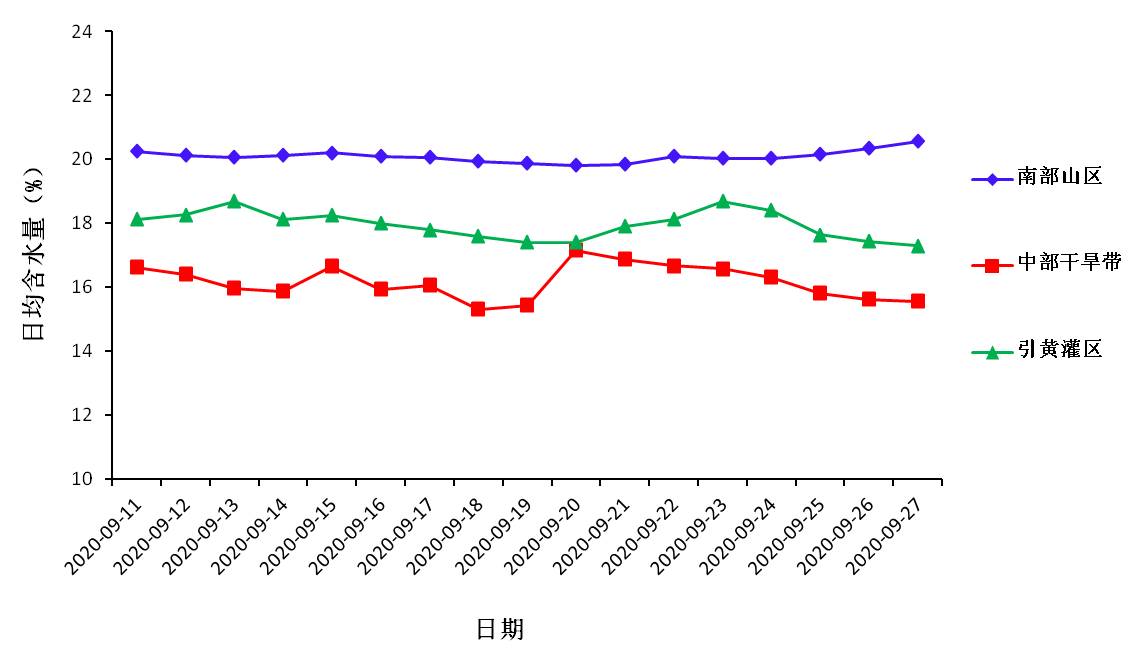 根据各生态区9月11日~9月27日墒情趋势图,由于近期南部山区降水频繁,土壤墒情持续向好;中部干旱带和引黄灌区9月下旬以来土壤墒情持续走低。