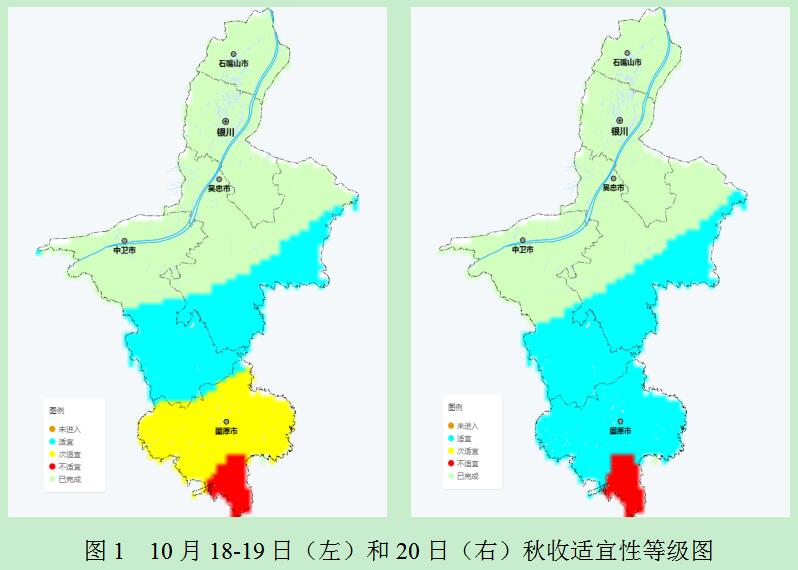 17-19日降水、大风天气对秋收有干扰,尤其中南部地区降水量相对较大,加之前期阴雨天气影响,原州区南部、泾源县大部土壤持续过湿,不适宜开展农机作业,其他未收获地区秋收适宜性为较适宜~适宜。20日全区晴到多云,对已收获作物的晾晒、存储有利,也有利于开展秋季整地、秋覆膜及冬灌工作。另外,20日南部山区大部地区最低气温降至0℃以下,对未收获的经济林果、露地蔬菜有不利影响。